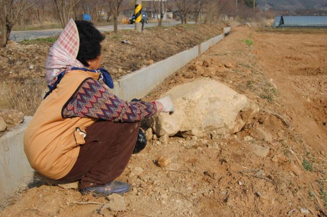 ±èõ¼· ¾¾ÀÇ ºÎÀÎÀÌ ³í¿¡¼ ³ª¿Â ¹ÙÀ§¸¦ ¼ÕÀ¸·Î °¡¸®Å°¸ç ÇѼûÀ» Áþ°í ÀÖ´Ù.