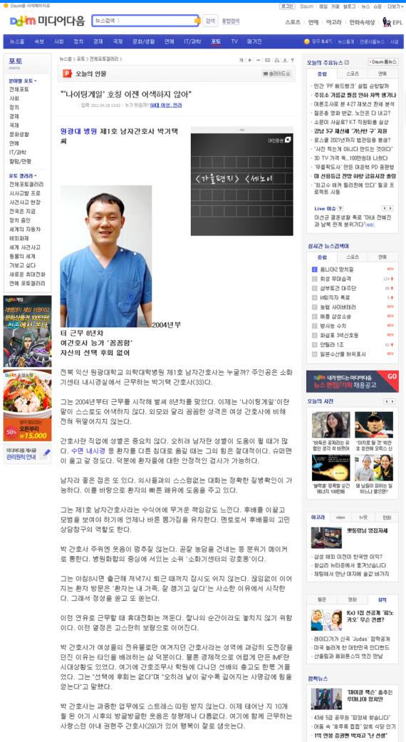 º»º¸ 4¿ù 18ÀÏÀÚ ÀÍ»ê¤ýÀÍ»êÀο¡ ¼Ò°³µÆ´ø ¿ø±¤´ëº´¿ø Á¦1È£ ³²ÀÚ°£È£»ç ¹Ú±âÅà ¾¾°¡ 18ÀÏ Æ÷ÅлçÀÌÆ® Daum ¿À´ÃÀÇ Àι°¿¡ ¼±Á¤µÆ´Ù.