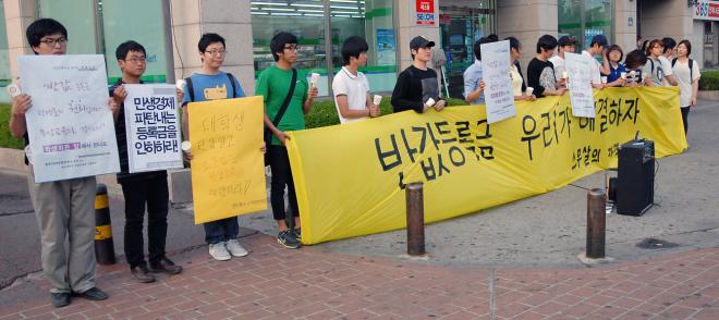8ÀÏ Àú³á 6½Ã ¿ø±¤´ë ÈĹ® ¾Õ. ¡®ÁÁÀº ´ëÇÐ ¿îµ¿º»ºÎ¡¯¸¦ ºñ·ÔÇÑ ¿ø±¤´ë ³» µ¿¾Æ¸® ȸ¿ø 10¿©¸íÀº ¡®¹Ý°ª µî·Ï±Ý ¿ì¸®°¡ ÇØ°áÇÏÀÚ- ½º¹« »ìÀÇ ÀÚ°Ý¡¯À̶ó ÀûÈù Çö¼ö¸·°ú ÇÔ²² ¡®¹Î»ý°æÁ¦ ÆÄź ³»´Â µî·Ï±ÝÀ» ÀÎÇÏÇ϶ó!¡¯°í ¾²ÀÎ ÇÇÄÏ µîÀ» µé°í Çлý ¹× °Å¸®¸¦ Áö³ª´Â ½Ã¹Îµé¿¡°Ô °í¾× µî·Ï±ÝÀÇ ½É°¢¼ºÀ» ¾Ë·È´Ù.