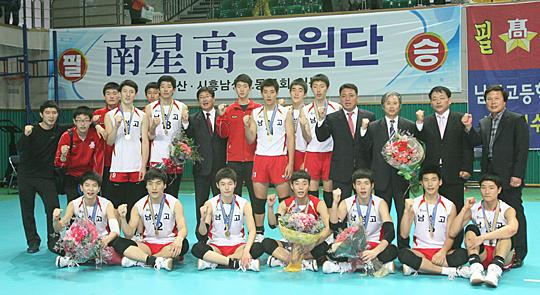 ³²¼º°í°¡ 11ÀÏ °æ±âµµ ¾È»ê½Ã ¿Íµ¿Ã¼À°°ü¿¡¼ ¹ú¾îÁø °æ±â ¼Û¸²°í¿ÍÀÇ ³²°íºÎ °á½Â¿¡¼ ¼¼Æ® ½ºÄÚ¾î 3-1·Î ´©¸£°í ¿ì½ÂÇÑ µÚ ¼±¼öµé°ú ȫöǥ ±³Àå, ±èÀºÃ¶ °¨µ¶ µî Çб³ °ü°èÀÚµéÀÌ ÆÄÀÌÆÃÀ» ¿ÜÄ¡°í ÀÖ´Ù. (³²¼º°í Á¦°ø)