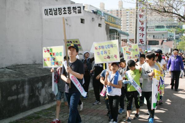 Âü°¡ÀÚµéÀº ¿ÀÀü 9½Ã¿¡ Çб³¸¦ Ãâ¹ßÇØ ¹è»êüÀ°°ø¿ø±îÁö ¾à 4km¸¦ °Å¸® ÇàÁøÇÏ¸é¼ ÀÍ»ê ½Ã¹Îµé¿¡°Ô °¡Á· »ç¶û°ú ³ª¶ó»ç¶û¿¡ ´ëÇÑ ¸Þ½ÃÁö¸¦ Àü´ÞÇϰí Çб³Æø·Â ¿¹¹æ Ä·ÆäÀÎÀ» ¹ú¿´´Ù.