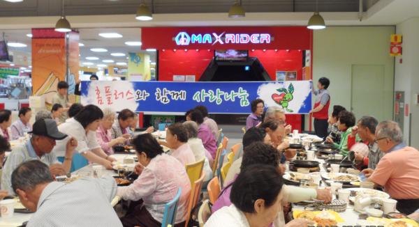 ȨÇ÷¯½º ÀÍ»êÁ¡ 1Ãþ ǪµåÄÚÆ®¿¡¼ ÁøÇàµÈ À̹ø Çà»ç´Â ÇѽÄ, Áß½Ä, ÀϽÄ, ¾ç½ÄÀ¸·Î ´Ù¾çÇÑ ¸Þ´º¸¦ ±¸¼ºÇØ ¾î¸£½ÅµéÀÇ ÀÔ¸À¿¡ ¸Â´Â À½½ÄÀ» Á¦°øÇß´Ù. ¶Ç ½ÄÇý¿Í ¼ö¹ÚÀ¸·Î ´õÀ§¸¦ ½Ã¿øÇÏ°Ô ½ÄÈú ¼ö ÀÖµµ·Ï ÇÏ°í ¾î¸£½Åµé¿¡°Ô ǪÁüÇÑ ¼±¹°À» ¾È°ÜÁֱ⵵ Çß´Ù.