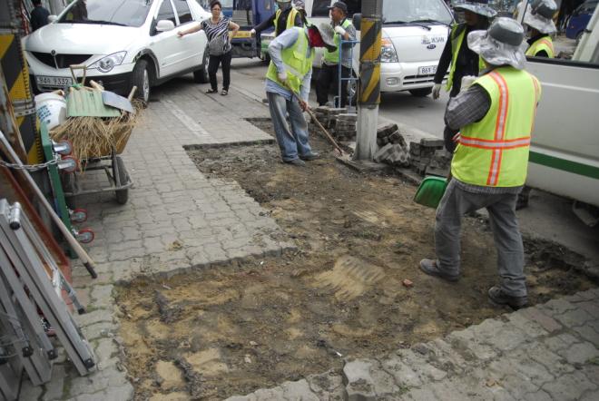 À̳¯ 10¿©¸íÀÇ ÀÍ»ê½Ã °ø¹«¿øµéÀÌ ±úÁö°í ¿òÇ« ÆÄÀÎ °÷ÀÇ º¸µµºí·ÏÀ» µé¾î³»ÀÚ ´ë´ëÀûÀ¸·Î º¸µµºí·Ï ±³Ã¼°ø»ç°¡ ½Ç½ÃµÇ´Â ÁÙ ¾Ë°í ¶Û µíÀÌ ¹Ý°¡¿üÁö¸¸ ÈÑ¼ÕµÈ ºÎºÐ¸¸ º¸¼öÇÏ´Â ¶«Áú ¼öÁØ¿¡ ±×ÃÆ±â ¶§¹®.
