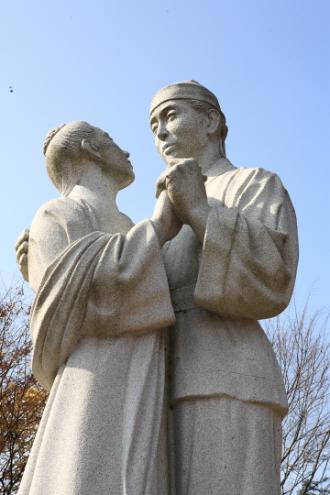 ±Ý¸¶Àú¼öÁö ¼ÂÊ Æí¿¡´Â ¼µ¿°ø¿øÀÌ ÀÚ¸®Çϰí ÀÖ´Ù. ¹éÁ¦ ¼µ¿(¹«¿Õ)°ú ½Å¶ó ¼±È°øÁÖÀÇ »ç¶ûÀÌ ´ã±ä °ø°£. µÎ »ç¶÷ÀÇ ´ÙÁ¤ÇÑ ¸ð½ÀÀ» Ç¥ÇöÇÑ Á¶°¢»óÀÌ ÀλóÀûÀÌ´Ù.