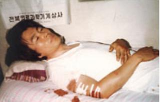 1980³â 6¿ù25ÀÏ ¹ã ÀüÁÖ ¿©»ê¼º´ç ÁÖÀӽźΠ¹Úâ½Å ½ÅºÎ°¡ »çÁ¦°ü¿¡¼ ±«ÇѵéÀÇ ±Þ½ÀÀ» ¹Þ¾Æ Áß»óÀ» ÀÔ°í ÀüºÏ´ëº´¿ø¿¡ ÀÔ¿øÇØ ÀÖ´Ù. ´ç½Ã ¡®5¡¤18 ±¤ÁÖÇ×ÀÀÇ Áø»óÀ» ´©±¸º¸´Ù ¾ÕÀå¼ ¾Ë·È´ø ±×´Â ÀÌÈÄ ¿À·§µ¿¾È °íÅ뽺·± Ä¡·á¸¦ ¹Þ¾ÒÀ¸³ª Áö±Ý²¯ Àå¾Ö¸¦ °Þ°í ÀÖ´Ù.