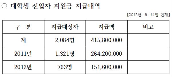1³â 2°³¿ù µ¿¾È ´ëÇлýµé¿¡°Ô Áö±ÞµÈ ¿¹»êÀº 2011³â 1õ321¸í 2¾ï6õ420¸¸¿ø, 2012³â 763¸í 1¾ï5õ160¸¸ ¿ø µî ¸ðµÎ 2õ84¸í 4¾ï1õ580¸¸ ¿øÀÌ´Ù.