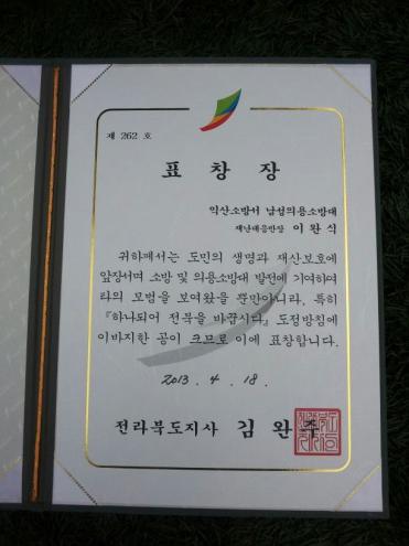 ¸¶µ¿ º¸¹è¼ÒÁÖ °øÀå ¿·¿¡ ¼¿ï¿ìÀ¯ ÀÍ»êºÏºÎ´ë¸®Á¡À» ¿î¿µÇÏ´Â ÀÌ¿Ï½Ä ¾¾(53)´Â ÀÍ»ê¼Ò¹æ¼ ³²¼ºÀÇ¿ë¼Ò¹æ´ë Àç³´ëÀÀ¹ÝÀåÁ÷À» ¼º½ÇÈ÷ ¼öÇàÇØ 18ÀÏ ±è¿ÏÁÖ ÀüºÏµµÁö»ç·ÎºÎÅÍ Ç¥Ã¢ÀåÀ» ¹Þ¾Ò´Ù.