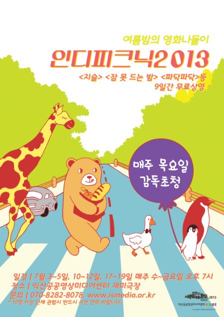ÀÍ»ê°ø°ø¿µ»ó¹Ìµð¾î¼¾ÅÍ(¼ÒÀå ÀÌÀç¿í)°¡ ÀεðÇÇÅ©´Ð 2013 ÀÍ»ê»ó¿µÈ¸¸¦ °³ÃÖÇÑ´Ù. 7¿ù 3ÀϺÎÅÍ 19ÀϱîÁö 3ÁÖ¿¡ °ÉÃÄ ¿¸®´Â À̹ø »ó¿µÈ¸´Â ¼ö¿äÀÏ, ¸ñ¿äÀÏ, ±Ý¿äÀÏ ¿ÀÈÄ 7½Ã¿¡ 9ÆíÀÇ ¿µÈ¸¦ »ó¿µÇÑ´Ù.