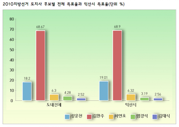 ½ÇÁ¦·Î Áö³ ¼±°Å¿¡¼ °¢ Èĺ¸ÀÚº° µµ³» ÇÕ°è µæÇ¥À²Àº Á¤¿îõ 18.20%, ±è¿ÏÁÖ 68.67%, ÇÏ¿¬È£ 6.30%, ¿°°æ¼® 4.28%, ±è´ë½Ä 2.52%·Î °¢°¢ Áý°èµÆ´Ù.