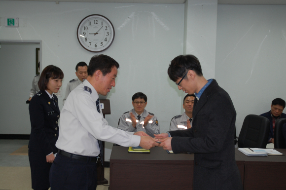 |  | | | ¨Ï ÀÍ»ê½Å¹® | | ÀÍ»ê°æÂû¼´Â 24ÀÏ ¿ÀÀü 2Ãþ ¼ÒȸÀǽǿ¡¼ Àýµµ¹üÀ» ºÙÀâÀº ½Ã¹Î ¹ÚÁø¼®(°¡¸í¡¤27)¾¾¿¡°Ô °¨»çÀå°ú ½Å°íº¸»ó±ÝÀ» ¼ö¿©Çß´Ù.