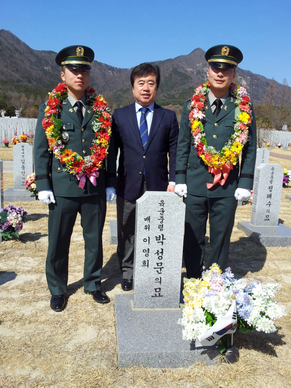 À̵éÀº 6.25 ÀüÀï´ç½Ã ³«µ¿° ÃÖÈĹæ¾î¼±¿¡¼ ¸ñ¼ûÀ» °É°í Á¶±¹À» ÁöÄѳ½ ÀÍ»êÃâ½Å ÀüÀ￵¿õ ͺ ¹Ú¼º¹® ¿¹ºñ¿ªÀÌ ¿µ¸éÇØÀÖ´Â ±¹¸³´ëÀüÇöÃæ¿øÀ» ã¾Æ Âü¹èÇÏ°í ¹éô°£µÎÀÇ À§±â¿¡¼ ³ª¶ó¸¦ ±¸ÇÑ °íÀÎÀÇ ¶æÀ» °è½ÂÇÒ °ÍÀÓÀ» ´ÙÁüÇß´Ù. ¹Ú ´ëÇ¥´Â "µÎ ¾ÆµéÀÌ ÇҾƹöÁö ¶æÀ» À̾î¹Þ±âÀ§ÇØ À°±ºÀå±³·Î ÀÓ°üÇÑ °Í¿¡ ´ëÇØ »ÑµíÇÏ°í ´ë°ßÇÑ ¸¶À½ÀÌ °¡µæÇÏ´Ù"°í ½É°æÀ» ¹àÇû´Ù.