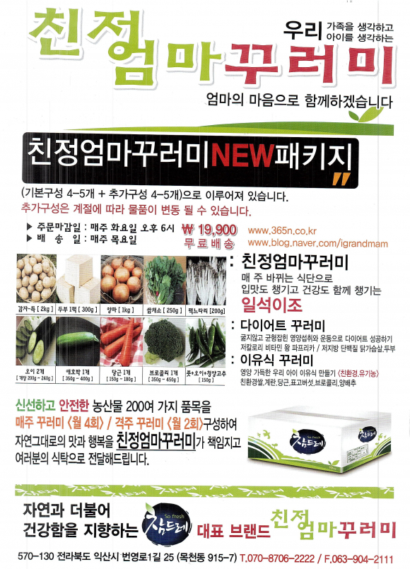 Ä£Á¤¾ö¸¶²Ù·¯¹Ì´Â ÀüºÏ ÀÍ»ê ¸ñõµ¿ ³ó¾÷ȸ»ç¹ýÀÎ(ÁÖ)Âüµå·¹¿¡ ½ÅûÇϸé Åù踦 ÅëÇØ 2ÁÖ¿¡ ÇÑ ¹ø¾¿ 1¸¸9õ900¿ø¿¡ ¹Þ¾Æº¼ ¼ö ÀÖ´Ù. ǰ¸ñÀº ģȯ°æ ÀÎÁõÀ» ¹ÞÀº ä¼Ò¿Í °úÀÏ, ´Þ°¿ µî 10¿© °¡Áö´Ù.