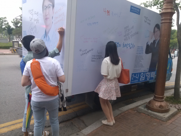 'Âü¿©¿Í ¼ÒÅë'ÀÇ ¼±°ÅÄ·ÆäÀÎÀ» ÆîÄ¡°í ÀÖ´Â ÀÓÇüÅà ķÇÁ´Â ½½·Î°ÇÀ» 'ÁøÂ¥ »õÁ¤Ä¡!'·Î Á¤Çϰí ÇöÀå Áß½ÉÀÇ Â÷ºÐÇÑ ½Ã¹Î¹ÐÂøÇü ¼±°Å¿îµ¿À» À§ÇØ 'ÀÓÇüÅà Èñ¸ÁžÂ÷'¸¦ ¿î¿µÇϰí ÀÖ´Ù°í ¹àÇû´Ù.