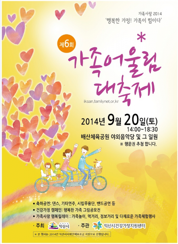 ÀÍ»ê½Ã °Ç°°¡Á¤Áö¿ø¼¾ÅͰ¡ ÁÖ°üÇÏ´Â À̹ø ÃàÁ¦´Â 'ÇູÇÑ °¡Á¤, °¡Á·ÀÌ ÈûÀÌ´Ù'¶ó´Â ÁÖÁ¦·Î °¡Á¤ÀÇ Á߿伺À» °Á¶Çϰí Áö¿ª¿¡ °¡Á·ÈÇÕ ºÐÀ§±â¸¦ Á¶¼ºÇϱâ À§ÇØ ¸¶·ÃµÆ´Ù.