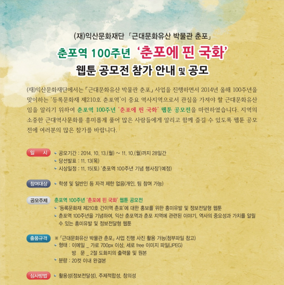 À̹ø °ø¸ðÀüÀº µå³ÐÀº µéÀ» °¡Áö°í ÀÖ¾î ´ëÀåÃÌ(ÓÞíÞõ½)À̶ó°í ºÒ¸®¸ç 1914³â °³ÅëºÎÅÍ ÀÏÁ¦¼öÅ»ÀÇ ¿ª»ç Áß½ÉÁöÀÎ ÃáÆ÷¿ªÀÌ ¿ÃÇØ 100ÁÖ³âÀ» ¸Â¾Æ ÃáÆ÷¿ª°ú ÃáÆ÷ Áö¿ª¿¡ °ü·ÃµÈ ¿¡ÇǼҵ峪 ¿ª»çÀÇ Á߿伺°ú °¡Ä¡¸¦ ¾Ë¸± ¼ö ÀÖ´Â Èï¹ÌÀ¯¹ß ¹× Á¤º¸Àü´ÞÇü À̾߱⸦ ÁÖÁ¦·Î À¥Å÷¡¤ÄÆ ¸¸È Çü½Ä Âü°¡ÀÛÀ» ¸ðÁýÇÑ´Ù.