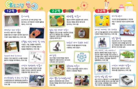 1±Ç¿ª ºÎ½º¿¡¼´Â °ø±â ´ëÆ÷, ³ª¸¸ÀÇ Ãµ¿¬ºñ´© ¸¸µé±â, ¹é¸¸¼ÛÀÌ Àå¹Ì ¸¸µé±â, ½ºÅиµ ¿£Áø Á¦ÀÛ ¹× ½Ã¿¬, Sound And Science, žç ÈæÁ¡ °üÂûÀÌ ÀÌ·ç¾îÁö°í, 2±Ç¿ª ÇÁ·Î±×·¥Àº ÃãÃß´Â Áøµ¿ ij¸¯ÅÍ ¸¸µé±â, ·¹Ã÷°í! ¸¶ÀÌ ÇÁ·£µå ·¹°í!, 4D Ã౸°ø, ¿¬±â »Õ´Â ¿ë°¡¸®¿Í ¼Ø»çÅÁ, ÅÊÅʺ¼ ¸¸µé±â, °ïÃæ¸ðÇü ¸¸µé±â°¡ ÁøÇàµÇ¸ç 3±Ç¿ª¿¡¼´Â ³ªµµ ÀÚ¶ó°í, ³Êµµ ÀÚ¶ó°í~!, ½Å³ª´Â ¾¾¸§ ·Îº¿ °æ±â, ·Îº¿ ¿ùµåÄÅ, ÀÚ¼®ÆØÀÌ, ¿ìµå Å©·¡ÇÁÆ®, ³ª¸¸ÀÇ Ä³¸¯ÅÍ ¸¸µé±â°¡ ÆîÃÄÁø´Ù. ¶ÇÇÑ ¿µÀç±³À° ÇÁ·ÎÁ§Æ® ¼ö¾÷ »êÃâ¹° ÀÚ·á°¡ Çö°ü¿¡ Àü½ÃµÇ¾î ÀÖ¾î¼ °ü¶÷µµ °¡´ÉÇÏ´Ù.