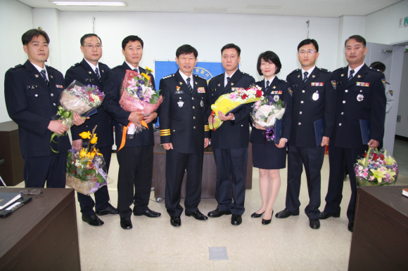 °È²¼ö ¼ÀåÀÌ Á÷Á¢ ½ÂÁøÀÚµéÀÇ ¾î±ú À§¿¡ °è±ÞÀåÀ» ´Þ¾Æ ÁÖ¾úÀ¸¸ç µ¿·á °æÂû°üµéÀÌ ½ÂÁøÀÚ¿¡°Ô ²É´Ù¹ßÀ» Àü´ÞÇϸç ÃàÇÏÀÇ ½Ã°£À» °¡Á³´Ù.