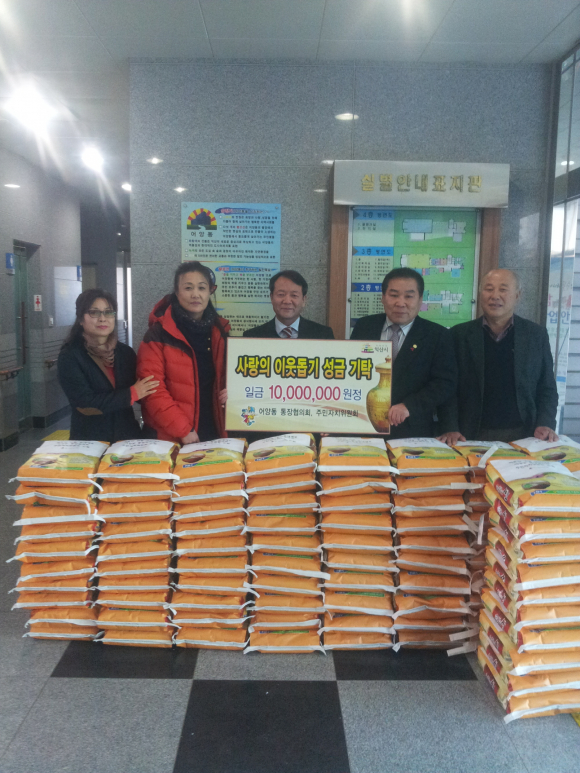 ¾î¾çµ¿ÅëÀåÇùÀÇȸ(ȸÀå ¿ø¿µÀÌ)¿Í ÁÖ¹ÎÀÚÄ¡À§¿øÈ¸(À§¿øÀå ¹æÀº±Ô)°¡ 29ÀÏ Ãµ¸¸¿ø»ó´çÀÇ ÀÌ¿ôµ½±â¼º±Ý°ú ¹é¹Ì¸¦ ¾î¾çµ¿ Áֹμ¾ÅÍ¿¡ ±âÅ¹ÇØ ÁÖÀ§¿¡ °¨µ¿À» ÀüÇϰí ÀÖ´Ù.