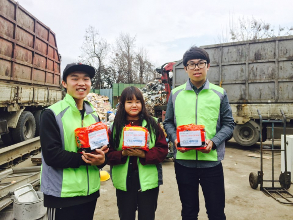 20¿© ¸íÀÇ »õº®À̽½ µ¿¾Æ¸® û¼Ò³âµéÀº ÀÍ»ê 4°÷ÀÇ °í¹°»ó ¾Õ¿¡¼ ÆóÁö¸¦ ÆÄ´Â ¾î¸£½Åµé¿¡°Ô »ç¶ûÀÇ ¶ó¸éºÀÁö¸¦ Àü´ÞÇßÀ¸¸ç, ¶ó¸éÀ» Àü´Þ ¹ÞÀº ¾î¸£½Åµé ÀÔ°¡¿¡´Â ȯÇÑ ¹Ì¼Ò°¡ ³ÑÃijµ´Ù.