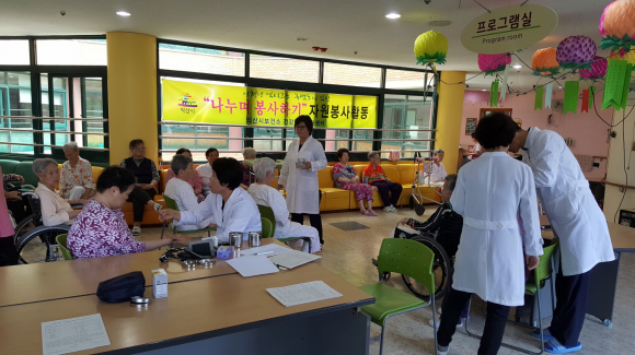 À̳¯ ¿ÀÀü °Ç°»ýȰÁö¿ø¼¾ÅÍÀåÀ» ºñ·ÔÇÑ Á÷¿ø 7¸íÀº ÀÍ»ê È¿µµ¸¶À»¿¡¼ ¿ä¾ç ÁßÀÎ ¾î¸£½Åµé¿¡°Ô ÇѹæÃѸíħ½Ã¼ú, ±âÃÊ°Ç°ÃøÁ¤(Ç÷¾Ð․Ç÷´ç), ½Åü±¸¼ººñ°Ë»ç(Àιٵð)¸¦ ½Ç½ÃÇϰí, ¾î¸£½ÅµéÀÇ ¸»¹þÀÌ µÇ¾î Áá´Ù.