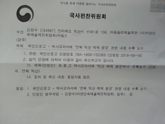±¹»çÆíÂùÀ§¿øÈ¸´Â (»ç)¸¶Çѹμӿ¹¼úÁ¦ÀüÀ§¿øÈ¸(À§¿øÀå ±è¿Ï¼ö)°¡ ÀÍ»ê½Ã¹Î ¼¸íÀ» ¹Þ¾Æ Á¦ÃâÇÑ ÀÍ»ê ¹éÁ¦¿Õ±Ã¿ª»ç ¿ª»ç±³°ú¼ ¼ö·Ï ¿ä±¸ ¹Î¿ø°ú °ü·Ã, Ãֱ٠ȸ½Å °ø¹®À» º¸³»¿Ô´Ù.