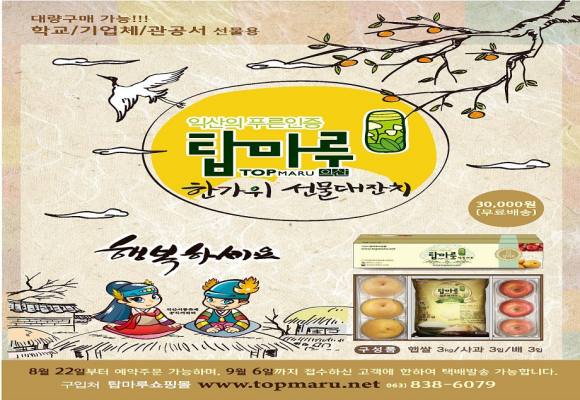 |  | | | ¨Ï ÀÍ»ê½Å¹® | | ÀÍ»ê½Ã ³ó¾÷±â¼ú¼¾ÅÍ¿¡¼ ´Ù°¡¿À´Â Ãß¼® ¸íÀýÀ» ¸Â¾Æ ÀÍ»ê½Ã °øµ¿³óƯ»ê¹° ºê·£µå ¡®Å¾¸¶·ç¡¯ Ãß¼®¸íÀý ¼±¹°¼¼Æ®¸¦ Ãâ½ÃÇß´Ù.