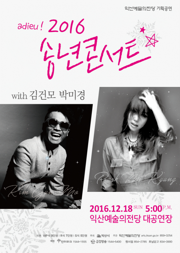 ¿øÁ¶ ±¹¹Î°¡¼ö ±è°Ç¸ð¿Í ÆÄ¿öÇ®ÇÑ µð¹Ù ¹Ú¹Ì°æÀÌ ÇÔ²²ÇÏ´Â '2016 ¼Û³â ÄܼƮ with ±è°Ç¸ð, ¹Ú¹Ì°æ' °ø¿¬ÀÌ ¿À´Â 18ÀÏ ¿ÀÈÄ 5½Ã Àͻ꿹¼úÀÇ Àü´ç¿¡¼ ¿¸°´Ù. À̹ø ÄܼƮ´Â 90³â´ë¸¦ dz¹ÌÇÑ µÎ °¡¼öÀÇ ÁÖ¿Á°°Àº ³ë·¡¸¦ °¨»óÇϸç ÇÑ ÇØ¸¦ ¸¶¹«¸® ÇÒ Æ¯º°ÇÑ ±âȸ°¡ µÉ °ÍÀ¸·Î ±â´ë¸¦ ¸ðÀ¸°í ÀÖ´Ù.