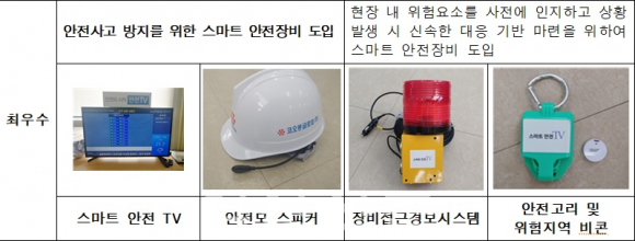 ÃÖ¿ì¼ö»ó ¼ö»óÀÛÀº ÇöÀå ³» À§Çè¿ä¼Ò¸¦ »çÀü ÀÎÁöÇÏ°í ±ä±Þ »óȲ ¹ß»ý ½Ã ½Å¼ÓÇÑ ´ëÀÀ ±â¹Ý È®º¸¸¦ À§ÇÑ ½º¸¶Æ® ¾ÈÀüÀåºñ¸¦ µµÀÔÇÏ¿© ÇöÀåÀÇ ¾ÈÀü°ü¸®¸¦ °³¼±ÇÑ »ç·ÊÀÌ´Ù.