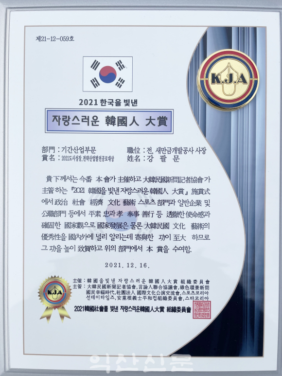 °ÆÈ¹® Àü »çÀåÀº »õ¸¸±Ý°³¹ß°ø»ç ÃÊ´ë»çÀåÀ¸·Î ÃëÀÓÇØ 30¿©³â°£ ÁöÁöºÎÁøÇß´ø »õ¸¸±Ý »ç¾÷À» ¾ÈÁ¤ÀûÀÌ°í ¼Óµµ°¨ ÀÖ°Ô ÃßÁøÇÑ °ø·Î¸¦ ÀÎÁ¤¹Þ¾Æ µµ½Ã¼ºÀ塤Àü·«»ê¾÷¹ßÀü ºÎ¹® ´ë»óÀ» ¼ö»óÇß´Ù.