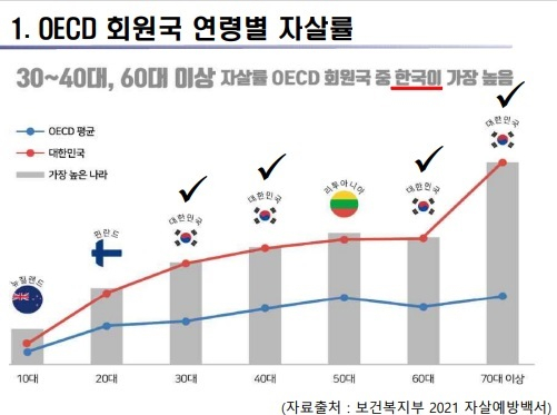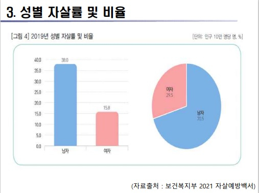±è ÀÇ¿øÀº À̳¯ ¡°2019³â ±âÁØ ´ëÇѹα¹ ÀÚ»ì·üÀº OECDÆò±Õº¸´Ù 2¹è °¡·®Àº ³ô¾Æ ¼¼°è 1À§ÀÌ°í ¼ºº° ÀÚ»ìÀ²À» »ìÆìº¸¸é ³²¼ºÀÌ ¿©¼ºº¸´Ù 2.4¹è °¡·® ³ôÀº °ÍÀ¸·Î ³ªÅ¸³ª°í ÀÖ´Ù¡±¸ç ¡° ÀÍ»êÁö¿ªÀÇ °æ¿ì ÀÚ»ì »ç¸ÁÀÚÀÇ ¼ºº° ºÐÆ÷¸¦ º¸¸é ³²¼º 76.3%¡¤ ¿©¼º 23.7%·Î ³²¼ºÀÌ ¿©¼ºº¸´Ù ¸¹À¸¸ç, ¿¬·É´ë·Î º»´Ù¸é 50´ë¿Í 70´ë°¡ ¸¹Àº ºÐÆ÷À̰í ÀÖ´Ù¡±°í Á¦½ÃÇß´Ù.