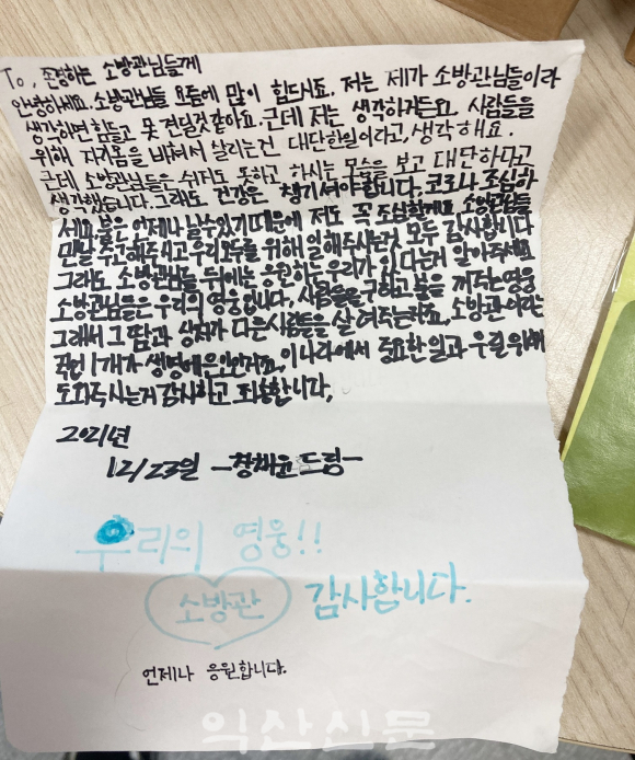 ÃÖ´ÙÀÎ ÇлýÀÇ ÆíÁö¿¡´Â ¡°¾ðÁ¦³ª ¿ì¸®°¡ ¾î·Á¿ò¿¡ óÇßÀ» ¶§ µµ¿Í Áּż °¨»çÇÕ´Ï´Ù. ÀúÈñÁý¿¡ ¸»¹úÁýÀÌ »ý±äÀûÀÌ ÀÖ¾ú´Âµ¥ ±×·²¶§µµ ¹Ù·Î Ãâµ¿ÇØ Áּż À§ÇèÇÒ ¶§ µµ¿ÍÁּż °¨»çµå¸³´Ï´Ù. ¼Ò¹æ°ü ¼±»ý´Ôµé ¾ðÁ¦³ª ÇູÇϼ¼¿ä¡±¶ó´Â °¨»çÀÇ ³»¿ëÀÌ ´ã°Ü ÀÖ¾ú´Ù.