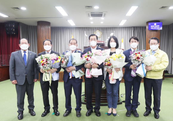 Àüü ½ÃÀÇ¿ø°ú Á¤ÇåÀ² ½ÃÀå µîÀÌ Âü¼®ÇÑ °¡¿îµ¥ ¿¸° À̳¯ Á¦242ȸ ÀÓ½Ãȸ Á¦2Â÷ º»È¸ÀÇÀå¿¡¼ ½ÃÀÇ¿øÀ¸·Î¼ ÈǸ¢ÇÏ°Ô ¼ÒÀÓÀ» ´ÙÇÑ ÀÇ¿ø 5¸í¿¡°Ô ±×°£ÀÇ ³ë°í¿¡ °¨»çÇÏ´Â Àǹ̷Π²É´Ù¹ßÀ» Àü´ÞÇÏ°í ¾Æ¸§´Ù¿î ¸¶¹«¸®¿Í »õ·Î¿î Ãâ¹ßÀ» ÇÔ²² ÃàÇÏÇÏ°í °Ý·ÁÇÑ °Í.