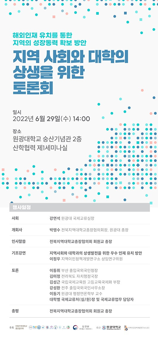 ÀüºÏÁö¿ª´ëÇб³ÃÑÀåÇùÀÇȸ(ȸÀå ¹Ú¸Í¼ö ¿ø±¤´ë ÃÑÀå)¿Í ¹ý¹«ºÎ ÀüÁÖÃâÀÔ±¹¡¤¿Ü±¹Àλ繫¼Ò°¡ °øµ¿ ÁÖÃÖÇϰí, ¿ø±¤´ë¿Í Áö¿ªÀ̹ÎÁ¤Ã¥°³¹ß¿¬±¸¼Ò°¡ ÁÖ°üÇÏ´Â Åä·Ðȸ´Â ÇØ¿ÜÀÎÀç À¯Ä¡¸¦ ÅëÇÑ Áö¿ªÀÇ ¼ºÀå µ¿·Â È®º¸ ¹æ¾È ¸ð»öÀ» À§ÇÑ ÀÚ¸®ÀÌ´Ù.