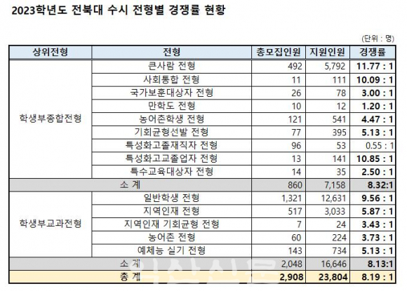 ÇÑÆí, ´Ü°èº° ÀüÇüÀ» ÅëÇØ ¼±¹ßÇÏ´Â ÀüºÏ´ë ÇлýºÎÁ¾ÇÕÀüÇüÀº 1´Ü°è ¼·ùÆò°¡¸¦ ÅëÇØ ¸ðÁý´ÜÀ§º° ¸ðÁýÀοøÀÇ 3¹è¼ö¸¦ ¼±¹ß, 11¿ù 11ÀÏ 1´Ü°è ÇÕ°ÝÀÚ¸¦ ¹ßÇ¥Çϰí, 11¿ù 24ÀÏ 2´Ü°è ¸éÁ¢À» °ÅÃÄ 12¿ù 15ÀÏ ÃÖÃÊ ÇÕ°ÝÀÚ¸¦ ¹ßÇ¥ÇÑ´Ù.