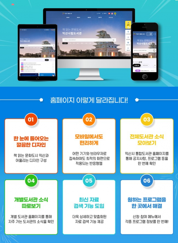 ÀÍ»ê½Ã´Â ½Ã¹ÎµéÀÇ Á¤º¸ ÀÌ¿ë ÆíÀǼºÀ» ³ôÀ̱â À§ÇØ ½º¸¶Æ®ÆùÀ̳ª ÅÂºí¸´¿¡¼ ȨÆäÀÌÁö(www.lib.iksan.go.kr)¸¦ »ç¿ëÇÒ ¼ö ÀÖµµ·Ï Àü¸é °³ÆíÇß´Ù°í ÀÌ´Þ 19ÀÏ ¹àÇû´Ù.