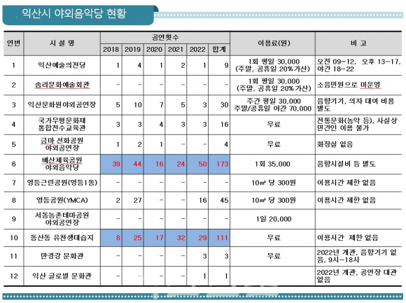¹ÚÁ¾´ë ½ÃÀÇ¿øÀº À̳¯ ¡°Äڷγª19¿¡ µû¸¥ »çȸÀû °Å¸®µÎ±â°¡ ÇØÁ¦µÅ 3³â¿©¸¸¿¡ °ø¿¬¡¤ÃàÁ¦ µî Çà»ç°¡ À̾îÁö¸é¼ ¿À·£¸¸¿¡ µ¹¾Æ¿Â °ø¿¬°ú ÃàÁ¦¸¦ ¸Â¾Æ ¼³·¹´Â ¸¶À½À¸·Î ¾ß¿Ü°ø¿¬ÀåÀ» ÇâÇÏ´Â ½Ã¹ÎµéÀÇ ¹ß±æÀÌ ´Ã°í ÀÖ´Ù¡±¸ç ¡°ÀÍ»ê½Ã °ü³»¿¡ 12°³ ¾Ö¿Ü°ø¿¬ÀåÁß ¹è»êüÀ°°ø¿ø°ú µ¿»êµ¿ À¯Ãµ»ýŽÀÁö ³»¿¡ ¼³Ä¡µÈ ¾ß¿Ü°ø¿¬ÀåÀÇ ÀÌ¿ë·üÀÌ ´Ù¸¥ ¾ß¿Ü°ø¿¬Àå¿¡ ºñÇØ »ó´çÈ÷ ³ôÀº °ÍÀ¸·Î È®Àεƴ١±°í ¼µÎ¸¦ ²¨³Â´Ù.