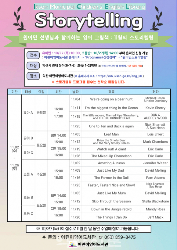 11¿ù ÇÁ·Î±×·¥Àº ¿À´Â 27ÀÏ À¯¾Æ 6~7¼¼´Â ¿ÀÀü 10½Ã, Ãʵî 1~2ÇгâÀº ¿ÀÈÄ 2½Ã ¿µ¾îµµ¼°ü ȨÆäÀÌÁö¿¡¼ ¼ö° ½ÅûÇÒ ¼ö ÀÖ´Ù.