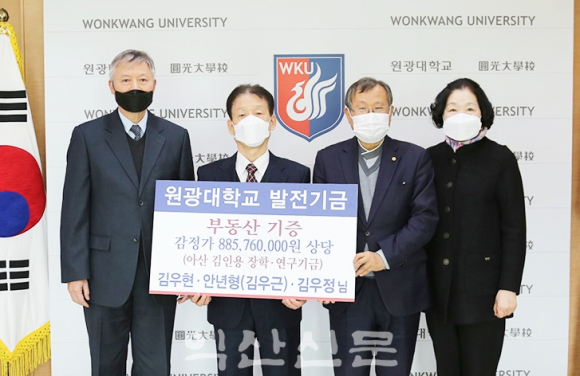 ¿ø±¤´ëÇб³(ÃÑÀå ¹Ú¸Í¼ö) ÃÊ´ë °ü¸®Ã³ÀåÀ» Áö³½ ¾Æ»ê ±èÀοë óÀå ÀÚ³àµéÀÌ °¨Á¤°¡ 9¾ï¿ø »ó´çÀÇ ÅäÁö¸¦ ´ëÇÐ ¹ßÀü±â±ÝÀ¸·Î ±âºÎÇß´Ù.