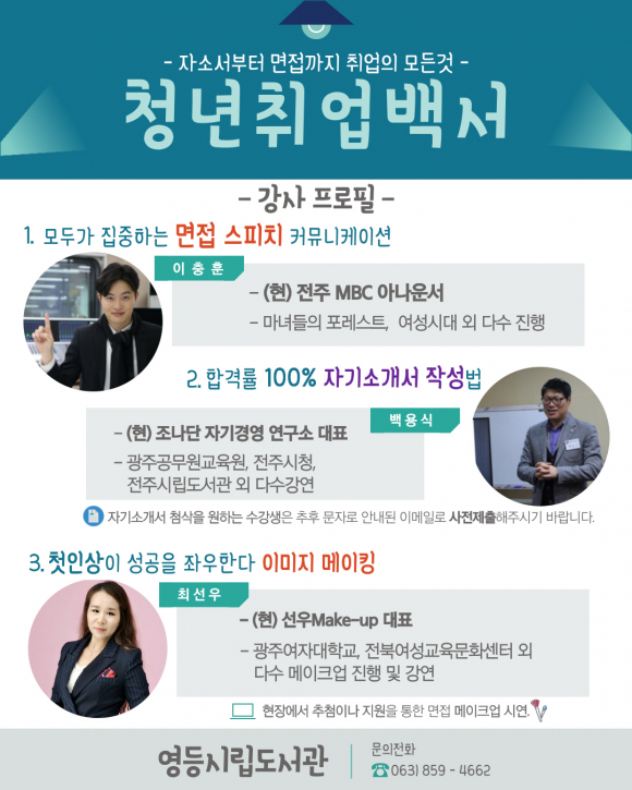 û³âÃë¾÷¹é¼´Â Áö¿ª û³âµéÀ» ´ë»óÀ¸·Î ¿À´Â 20ÀϺÎÅÍ 22ÀϱîÁö 3Àϰ£ ÁøÇàµÇ´Â Ãë¾÷ ÇÁ·Î±×·¥À¸·Î ÀÚ±â¼Ò°³¼ ÀÛ¼º¹ýºÎÅÍ ¸éÁ¢ Áغñ¸¦ À§ÇÑ °¿¬À¸·Î ±¸¼ºµÅ ÀÖ´Ù.