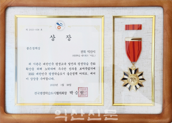 ÀÍ»ê½Ã°¡ ¡®Á¦1ȸ ´ëÇѹα¹Æò»ýÇнÀµµ½Ã ÁÁÀºÁ¤Ã¥ AWARD¡¯°ø¸ðÀü ½Ã»ó½Ä¿¡¼¡®ÁÁÀº Á¤Ã¥»ó¡¯°ú ¡®Æò»ý±³À°»ç»ó¡¯À» ¼ö»óÇß´Ù°í 1¿ù 25ÀÏ ¹àÇû´Ù.