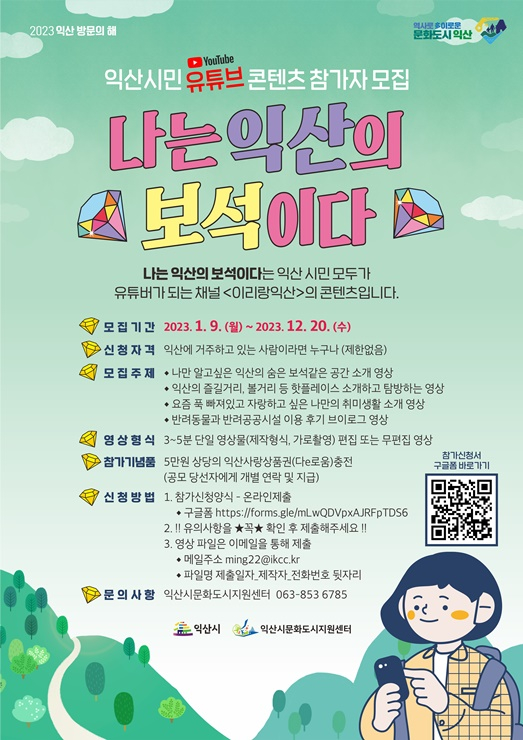ÀÍ»ê½Ã´Â Àͻ깮ȵµ½ÃÁö¿ø¼¾ÅÍ¿Í ÇÔ²² ¹®Èµµ½Ã À¯Æ©ºê ä³Î ¡®À̸®¶ûÀͻꡯ ÄÜÅÙÃ÷ Á¦ÀÛ¿¡ Âü¿©ÇÒ ¡®³ª´Â ÀÍ»êÀÇ º¸¼®ÀÌ´Ù(³ªÀͺ¸)¡¯½Ã¹Î À¯Æ©¹ö¸¦ ¿À´Â 12¿ù 20ÀϱîÁö ¸ðÁýÇÑ´Ù°í ¹àÇû´Ù.