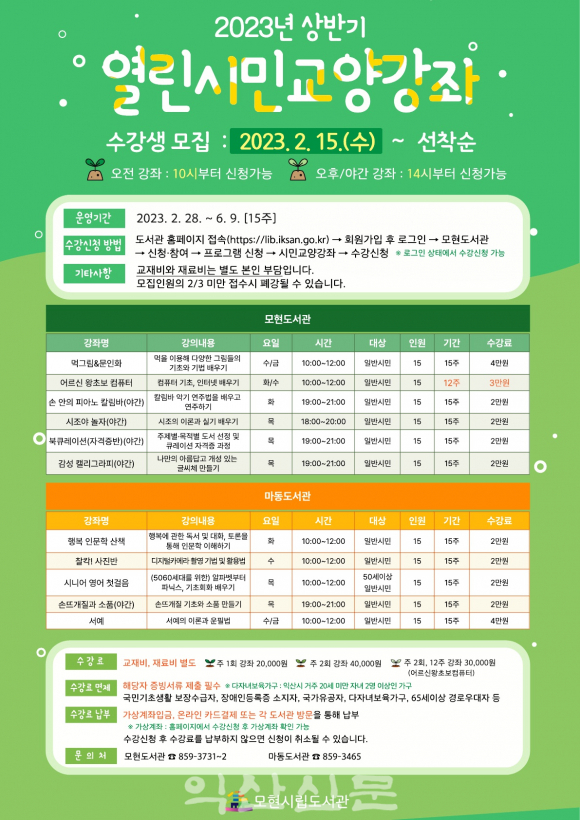 °Á ½ÅûÀº ÀÍ»ê½Ã¸³µµ¼°ü ȨÆäÀÌÁö(http://lib.iksan.go.kr)¿¡¼ ¼±Âø¼øÀ¸·Î ¸ðÁýÇϸç, 8ÁÖ¿¡¼ 15ÁÖ±îÁö °Á ±â°£À» ´Ù¾çÇÏ°Ô Æí¼ºÇØ ¿î¿µÇÑ´Ù.