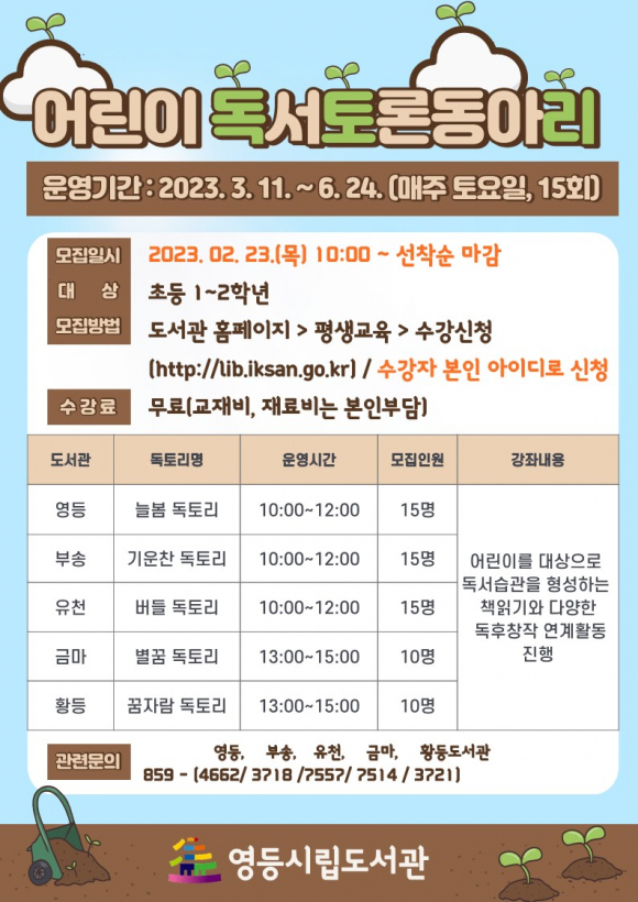 ÃʵîÇлý 1~2ÇгâÀ» ´ë»óÀ¸·Î Ã¥Àбâ¿Í ±Û¾²±â, ´Ù¾çÇÑ µ¶ÈÄ Ã¢ÀÛ ¿¬°èȰµ¿À» ÁøÇàÇÏ´Â ¾î¸°ÀÌ µ¶¼Åä·Ðµ¿¾Æ¸® ¡®µ¶Å丮¡¯ÇÁ·Î±×·¥À» µµ¼°üº°·Î ÁøÇàÇÑ´Ù.