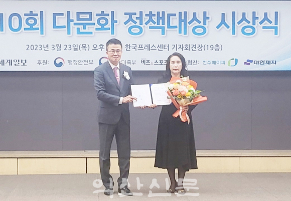 Á¶³²¿ì ¿©¼º°¡Á·°úÀåÀº ¡°Á¦10ȸ ´Ù¹®ÈÁ¤Ã¥´ë»ó Ưº°»ó ¼ö»óÀº ¼º¼÷ÇÑ ´Ù¹®È»çȸ¸¦ ¼±µµÇÏ´Â ÀÍ»ê½ÃÀÇ ³ë·ÂÀÌ Àü±¹ÀûÀ¸·Î ÀÎÁ¤¹ÞÀº °á°ú¡±¶ó¸ç ¡°¾ÕÀ¸·Îµµ ¼¼½ÉÇÑ ´Ù¹®ÈÁ¤Ã¥À¸·Î º¹Áöü°¨µµ¸¦ ³ôÀÌ°í ³»¿Ü±¹ÀÎÀÇ »çȸÅëÇÕÀ» À§ÇØ ÃÖ¼±À» ´ÙÇϰڴ١±°í ÀüÇß´Ù.