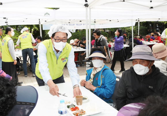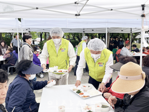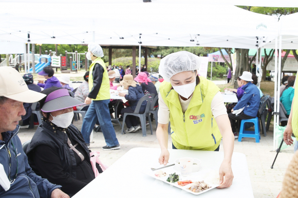 300¿©¸íÀÇ ¾î¸£½ÅµéÀÌ Ã£Àº À̳¯ ¡®´ÙÀ̷οò ¹äÂ÷¡¯ ¹«·á±Þ½ÄÀå¿¡¼ ÃÖÁ¾¿À ÀÇÀåÀ» ºñ·ÔÇÑ ÀÇ¿ø 12¸í°ú ÀÇȸ»ç¹«±¹ Á÷¿ø µî 30¿©¸íÀÌ Âü¿©ÇØ ºÀ»çȰµ¿À» Àü°³, Áö¿ª»ç¶ûÀ» ½ÇõÇϰí ÀÚ¿øºÀ»ç Ȱ¼ºÈ¿¡ ±â¿©ÇÏ´Â ¸ð½ÀÀ» º¸¿©Áá´Ù.