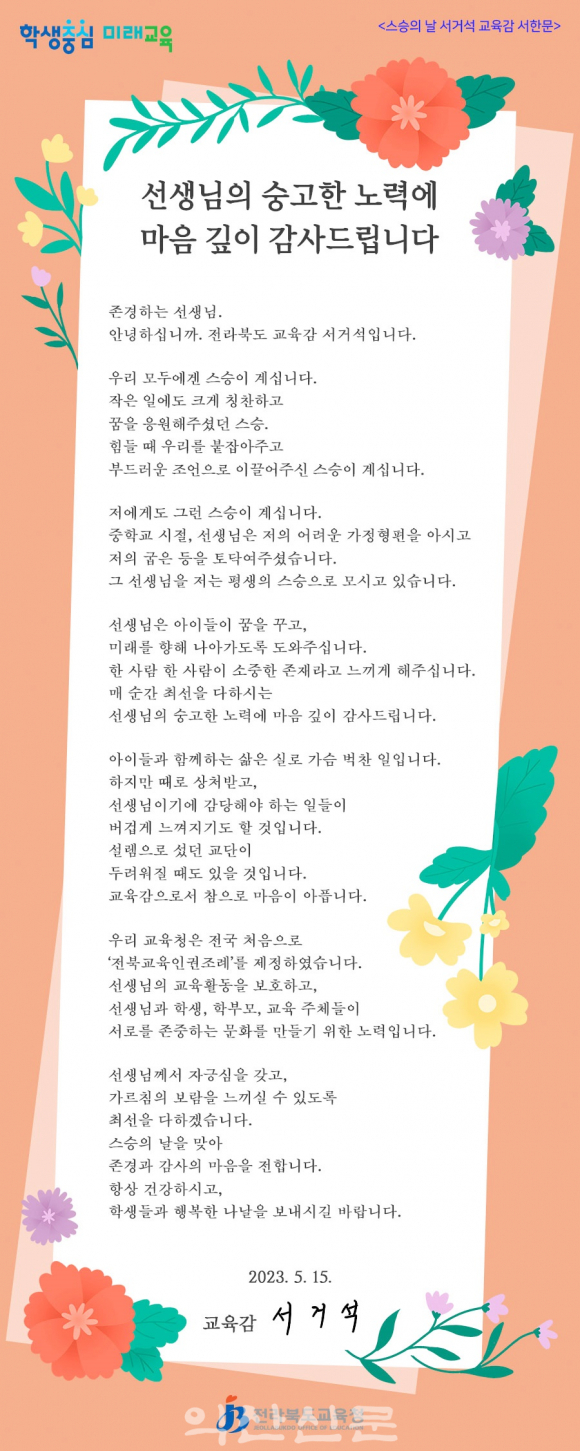 ¼ ±³À°°¨Àº ÀÌ´Þ 12ÀÏ ½º½ÂÀÇ ³¯ ±â³ä ¼Çѹ®À» ÅëÇØ ¡°¿ì¸® ¸ðµÎ¿¡°Ô´Â ÀÛÀº ÀÏ¿¡µµ Å©°Ô ĪÂùÇÏ°í ²ÞÀ» ÀÀ¿øÇØÁ̴ּø ½º½Â, Èûµé ¶§ ºÙÀâ¾ÆÁÖ°í ºÎµå·¯¿î Á¶¾ðÀ¸·Î À̲ø¾îÁֽнº½ÂÀÌ ÀÖ´Ù¡±¸é¼ ¡°¼±»ý´ÔÀÇ ¼þ°íÇÑ ³ë·Â¿¡ ¸¶À½ ±íÀÌ °¨»çµå¸°´Ù¡±°í ¹àÇû´Ù.