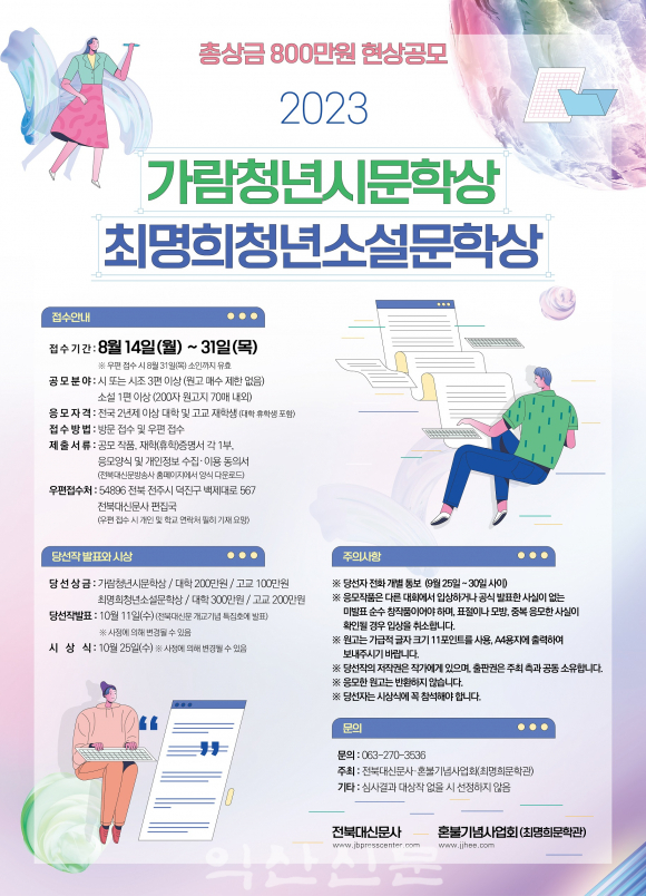 ÀüºÏ´ë ½Å¹®¹æ¼Û»ç¿Í È¥ºÒ±â³ä»ç¾÷ȸ(´ëÇ¥ ±èº´¿ë)¡¤ÃÖ¸íÈñ¹®Çаü(°üÀå ÃÖ±â¿ì)ÀÌ °øµ¿À¸·Î ÁÖ°üÇÏ´Â À̹ø °ø¸ðÀüÀº 2023³â 8¿ù 31ÀϱîÁö ÀÛǰÀ» Á¢¼öÇÑ´Ù.