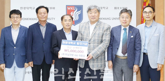 ±¹³» Á߰߰Ǽ³¾÷üÀÎ µÎ³²°Ç¼³ ÀÌÁ¾±æ ´ëÇ¥À̻簡 ¸ð±³ÀÎ ¿ø±¤´ëÇб³(ÃÑÀå ¹Ú¼ºÅÂ) »ç¹ü´ëÇлýµéÀÇ ±³À° ¿ª·®À» Áö¿øÇϰí, Çй® ¿¬±¸ Àå·Á¸¦ À§ÇÑ ¹ßÀü±â±Ý 500¸¸¿øÀ» ÀÌ´Þ 11ÀÏ ¿ø±¤´ë¸¦ ¹æ¹®ÇØ ±âŹÇß´Ù.