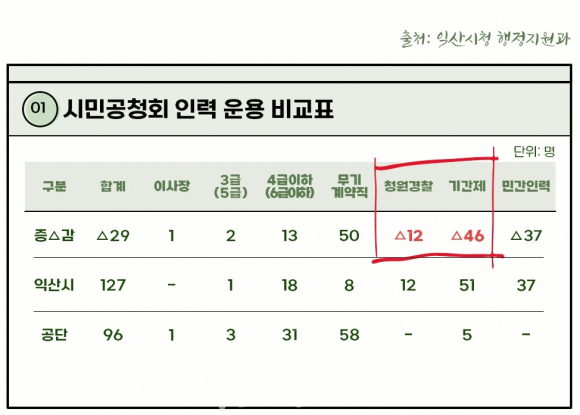 Àå ÀÇ¿øÀº ¡°½Ã¹Î°øÃ»È¸ ´ç½Ã ÀÍ»ê½Ã°¡ °ø´Ü ¼³¸³ÀÇ ´çÀ§¼ºÀ» ÁÖÀåÇϸç 12¸íÀΠû°æÀ» ¸ðµÎ °¨¿øÇÏ°í ±â°£Á¦ ±Ù·ÎÀÚµµ 46¸í °¨¿øÇÑ´Ù°í Á¦½ÃÇßÀ¸³ª ¿Ã 6¿ù ½ÃÀÇȸ Á¦1Â÷ Á¤·Êȸ¿¡ º¸°íÇÑ ¡®µµ½Ã°ü¸®°ø´Ü ¼³¸³¿¡ µû¸¥ Àη°¨Ãà°èȹ¿¡´Â û¿ø°æÂû °¨¿øÀÌ 3¸íÀÌ¸ç ±×¸¶Àúµµ ÇàÁ¤Áö¿ø°ú¿¡ Àç¹èÄ¡·Î µÅ ÀÖ´Ù¡±°í ¹®Á¦¸¦ Á¦±âÇß´Ù.