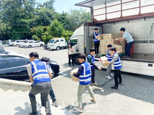 Çѱ¹¼öÀÚ¿ø°ø»ç ÀüºÏÁö¿ªÇù·Â´Ü(ÀÌÇÏ ¼ö°ø ÀüºÏÇù·Â´Ü)ÀÌ ÀÍ»ê½Ã»ó¼öµµ»ç¾÷´ÜÀ» ã¾Æ ÀçÇØ º¹±¸¸¦ À§ÇÑ ºñ»ó½Ä¼ö¿ë ¹°(1.8L) 1,560º´À» Àü´ÞÇß´Ù.